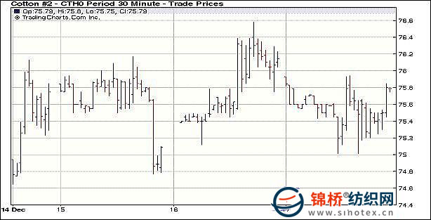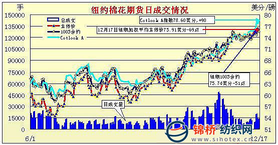 12月17日,受外部市場壓力,紐約期棉全面下滑,主力3月合約收于75.74美分/磅,跌51點,1005月合約76.26美分/磅,跌78點。當日市場開盤不久即受到投機和基金強大賣盤壓力,外部美元大漲,股市、農(nóng)產(chǎn)品期貨、金屬期貨和原油期貨集體跳水,迫使紐約期棉下挫,3月合約最低點跌至75.01美分(-124點)。相比其他期貨市場,期棉在尾段表現(xiàn)相對強勢,基本面中國用棉量預(yù)期增加對市場形成支持,最后階段3月合約回補前期部分跌幅,最終結(jié)算價75.74美分/磅。