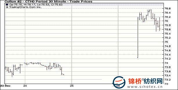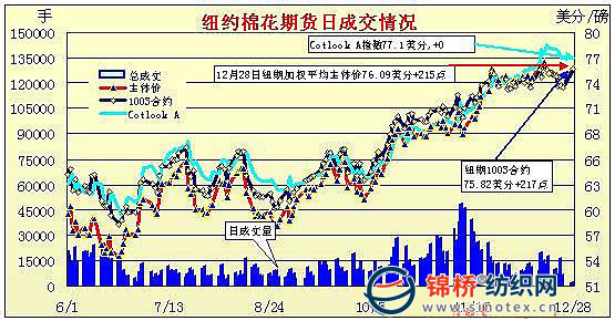 12月28日,圣誕節(jié)后美元下跌,芝加哥大豆,紐約原油等品種紛紛上揚(yáng),同時(shí)中國鄭州期棉漲停報(bào)收,經(jīng)濟(jì)復(fù)蘇信心增強(qiáng),均利好紐約期棉開盤大漲,盤中窄幅波動(dòng),盤終各合約均大幅收漲,同時(shí)交投放量。當(dāng)日紐約期棉交易時(shí)間縮短,但由于鄭州棉花市場漲停效應(yīng),刺激紐約期棉開盤大漲,同時(shí),外圍利好刺激投機(jī)買盤,觸發(fā)止損買盤,近期3月主力合約盤中最高觸及76.54美分/磅的高位,之后主力3月合約從高位小幅回落,但盤終依然漲217點(diǎn)報(bào)收。當(dāng)日大豆3月合約勁漲30美分報(bào)收每蒲式耳10.38美元。 紐約棉花期貨首期1003合約近三個(gè)交易日交易走勢