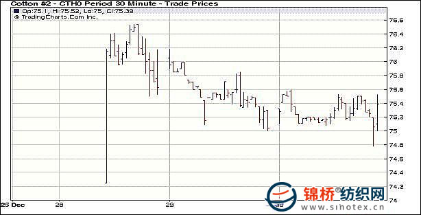 12月30日,美元小幅走高,外圍漲跌不一,期棉走勢略顯獨立,小幅回落,尾盤收漲。當(dāng)日紐約期棉再陷區(qū)間波動,早盤期棉在賣盤的壓力下走弱,3月合約跌破75美分,最低74.78美分,但尾盤半小時內(nèi)買盤介入,推動各合約快速回升,收回跌幅,并小幅收漲。外圍市場漲跌不一,期棉走勢相對獨立,市場密切關(guān)注中國的產(chǎn)量和消費量。期貨交投不活躍,但期權(quán)交投略顯活躍,大約成交8500手看漲期權(quán)和1000手看跌期權(quán)。 紐約棉花期貨首期1003合約近三個交易日交易走勢 |