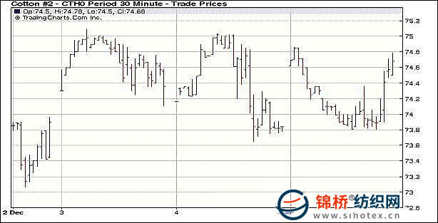12月7日,紐約期棉受投機(jī)買盤支持中幅收漲,成交量維持低量。主力3月合約收于74.69美分/磅,漲87點(diǎn)。當(dāng)日市場開盤窄幅震蕩,后受美元走強(qiáng)影響下行。美元上漲動(dòng)能減弱,期棉跌勢減緩,外部股市上漲,帶動(dòng)期棉向上,加上投機(jī)買盤支持,市場尾盤強(qiáng)勢反彈,最終以中幅上漲收盤。 紐約棉花期貨主力1003合約近三個(gè)交易日交易走勢 |