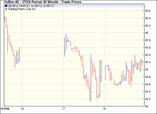 經(jīng)歷前五個交易日下跌后,18日紐約期棉市場以小幅上漲收盤,近期3月合約收于43.88美分/磅,漲35點,主力5月合約45.09美分/磅,漲41點。當(dāng)日市場開盤前四個小時一直處于弱勢下跌狀態(tài),外部市場持續(xù)下跌給予的壓力明顯。后拋開外部壓力,市場在技術(shù)買盤和空頭平倉支持下反彈走高,在前五個交易日累計約下跌600點后以小陽報收。 紐約棉花期貨主力0905合約近三個交易日交易走勢 |