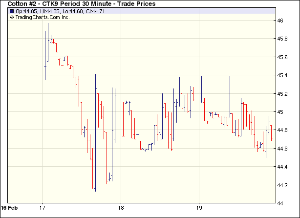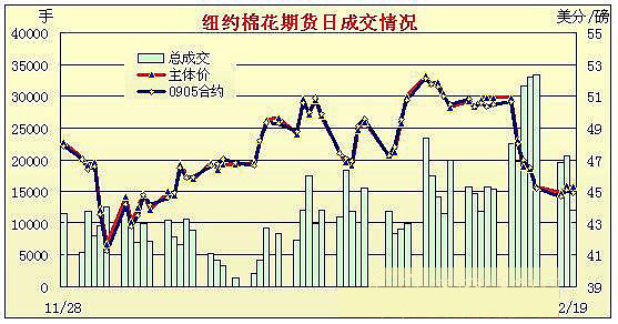 在美元下跌和原油期貨上漲的托舉下,紐約期棉市場(chǎng)高開高走。美國(guó)道瓊斯工業(yè)平均指數(shù)下跌給市場(chǎng)帶來壓力,19日紐約期棉小幅下跌,近期3月合約收于43.32美分/磅,跌47點(diǎn),主力5月收于44.91美分/磅,跌19點(diǎn),其它合約均下跌20余點(diǎn)。2月23日為3月合約第一個(gè)交割通知日,交易商清算該合約頭寸,因此其跌幅大于其它合約。 紐約棉花期貨主力0905合約近三個(gè)交易日交易走勢(shì) |