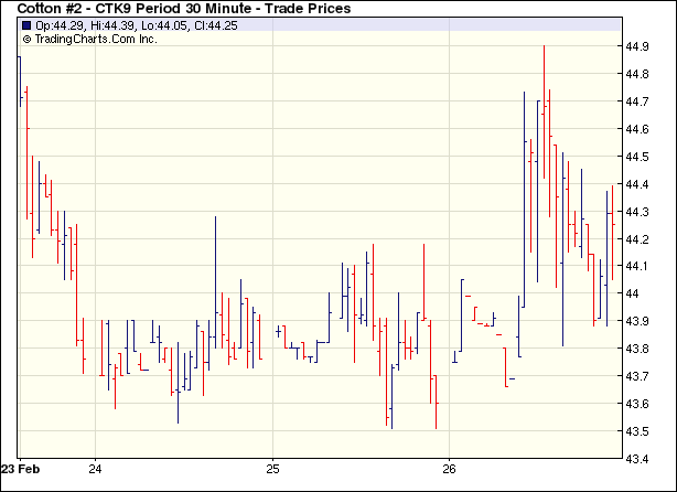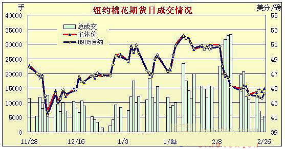 2月26日紐約期棉市場(chǎng)在連跌五日后終現(xiàn)反彈,雖然外部谷物和股市繼續(xù)下跌,市場(chǎng)獲得基本面利好支持,以全面上漲收盤(pán),主力5月合約收于44.24美分,漲68點(diǎn)。當(dāng)日市場(chǎng)經(jīng)歷穩(wěn)中偏弱的開(kāi)局后,受利好的出口周報(bào)刺激以及投機(jī)商和貿(mào)易買(mǎi)盤(pán)支持,市場(chǎng)破位上揚(yáng),5月合約最高點(diǎn)達(dá)到44.90美分/磅(+134點(diǎn))。后因少量的獲利賣(mài)盤(pán)打壓,市場(chǎng)回吐部分漲幅,但未更改市場(chǎng)收漲的大局。另?yè)?jù)美國(guó)農(nóng)業(yè)部數(shù)據(jù),2.13-2.19一周美國(guó)凈簽約出口本年度陸地棉13萬(wàn)噸,較前一周增加35%,其中中國(guó)進(jìn)口約占半數(shù)。 紐約棉花期貨主力0905合約近三個(gè)交易日交易走勢(shì) |