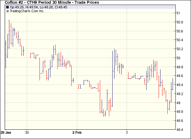 2月3日,市場(chǎng)信心仍舊缺乏,紐約期棉在50美分之下窄幅徘徊小幅收跌,近期3月合約收于49.38美分/磅,跌33點(diǎn),0905月合約收于50.32美分,跌48點(diǎn)。當(dāng)日市場(chǎng)整日都處于弱勢(shì)狀態(tài)。3月合約以49.53美分/磅開盤,小跌18點(diǎn);盤中因信心不足、期權(quán)市場(chǎng)成交清淡、以及外部市場(chǎng)大豆和玉米持續(xù)走低,期棉市場(chǎng)中幅下跌,3月合約最低跌至48.75美分(-96點(diǎn))。尾段少量投機(jī)商空頭平倉,市場(chǎng)回補(bǔ)部分跌幅,最終小跌收盤。分析師指出,在本月的美國(guó)農(nóng)業(yè)部供需預(yù)測(cè)報(bào)告和美國(guó)國(guó)家棉花總會(huì)種植意向出臺(tái)之前,市場(chǎng)觀望氣氛濃厚,交易商難有大動(dòng)作;棉花走勢(shì)將繼續(xù)跟隨大豆和玉米的方向。 紐約棉花期貨首期0903合約近三個(gè)交易日交易走勢(shì) |