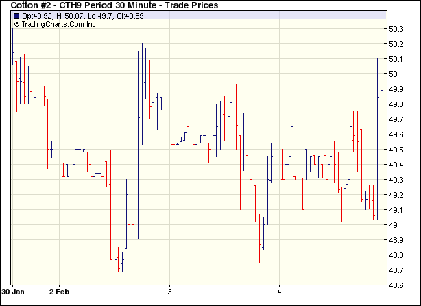 2月4日紐約期棉小幅收漲,近期3月合約收于49.67美分,漲29點(diǎn),0905收于50.58 美分,漲26點(diǎn)。3月合約盤(pán)中最高點(diǎn)50.10美分,最低點(diǎn)49.02美分,即波動(dòng)區(qū)間為108點(diǎn)。當(dāng)日市場(chǎng)開(kāi)盤(pán)走低,但當(dāng)3月合約在靠近49美分時(shí)得到技術(shù)性買(mǎi)盤(pán)支持,反彈沖破50美分一線(xiàn)。后買(mǎi)盤(pán)跟進(jìn)力量不足 ,市場(chǎng)小幅回落。當(dāng)外部谷物市場(chǎng)開(kāi)盤(pán)后,大豆和玉米期貨走強(qiáng),同時(shí)原油期貨走高,加上有空頭平倉(cāng)支持,市場(chǎng)最終穩(wěn)定收漲。 紐約棉花期貨首期0903合約近三個(gè)交易日交易走勢(shì) |