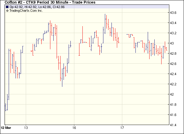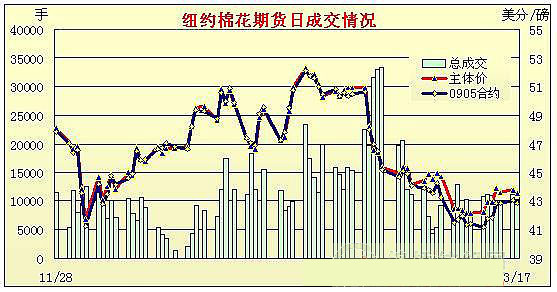 3月17日,美國(guó)房屋開工率意外上升,提振股市飆升,美國(guó)道指大漲2.48%,標(biāo)普500漲3.21%,美元走弱,4月原油盤中逼近50美元,外圍整體利好,但期棉窄幅區(qū)間震蕩,成交清淡,盤終5月合約跌20點(diǎn)收于42.85美分,7月合約跌30點(diǎn)收于43.65美分。當(dāng)日紐約期棉小幅高開,但外圍強(qiáng)勢(shì)并未支撐期棉延續(xù)走高,買盤興趣寡淡,兼少許投機(jī)賣盤促使期棉回落,盤中期棉5月合約曾短暫小幅沖高,但終究滑落,盤終除遠(yuǎn)月2份合約跌幅超過100點(diǎn),其它合約跌幅均在26點(diǎn)之內(nèi)。成交略有放大,但交投依然乏善可陳,繼續(xù)等候進(jìn)一步的方向指引。 紐約棉花期貨首期0905合約近三個(gè)交易日交易走勢(shì) |