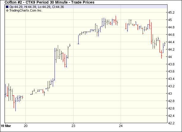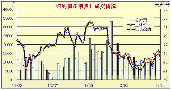 3月24日美國股市調整走跌,美元企穩(wěn),原油走弱,紐約期棉遭遇獲利平倉盤的強勢壓力,低開低走,盤終中幅收跌,5月合約跌72點收于44.31美分,7月合約跌69點收于45.28美分。當日紐約期棉未能承接前日的上漲勢頭,在外圍壓力之下展開調整,小幅低開,并不斷盤整下挫,午盤后看跌期權加大打壓力度,期棉進一步回落,主力5月合約最低跌至43.95美分,但盤終略有小幅回調,各合約中幅收跌,同時成交再度縮量。美國標普指數(shù)回落2.03%,道指下跌1.49%;而美元指數(shù)則企穩(wěn)反彈。