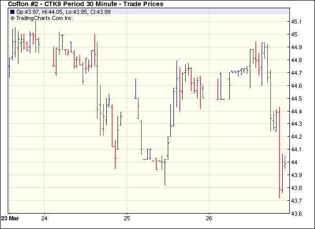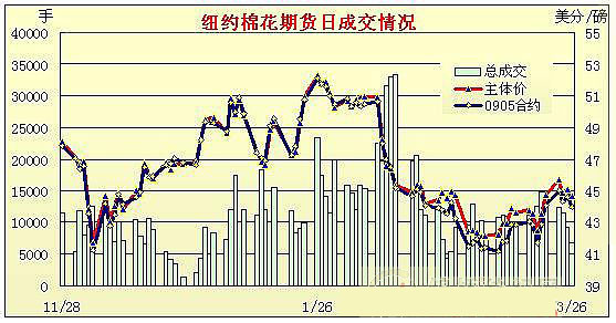 3月26日美國(guó)失業(yè)人數(shù)和第四季度GDP公布,依然不樂(lè)觀,但優(yōu)于市場(chǎng)之預(yù)期,同時(shí)美棉出口周報(bào)顯示美棉銷售良好為紐約期棉早盤(pán)帶來(lái)積極提振,但稍后的美國(guó)國(guó)內(nèi)紡織消費(fèi)大為低迷又為賣(mài)盤(pán)創(chuàng)造良機(jī),大肆打壓,觸及止損賣(mài)盤(pán),盤(pán)終各合約下跌70點(diǎn)之內(nèi),5月合約跌62點(diǎn)收于43.96美分,7月合約跌68點(diǎn)收于44.89美分。當(dāng)日紐約期棉小幅高開(kāi),早盤(pán)期間,外圍消息利好,投機(jī)買(mǎi)盤(pán)推動(dòng)期棉小幅上揚(yáng),但5月合約超過(guò)前日的最高價(jià)之后買(mǎi)盤(pán)乏力,兼之公布美國(guó)內(nèi)紡織消費(fèi)頗為低迷,貿(mào)易商賣(mài)盤(pán)加壓,在44.49美分之際觸發(fā)止損賣(mài)盤(pán),期棉加速回落,最低43.72美分,盤(pán)終略有回調(diào),但依然中幅收低。不過(guò)成交略現(xiàn)活躍。 紐約棉花期貨首期0905合約近三個(gè)交易日交易走勢(shì) |