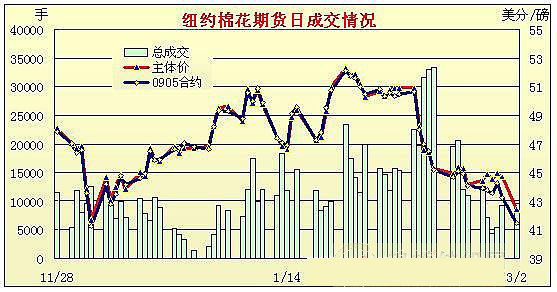 3月2日,資本市場一片利空,亞歐股市紛紛大跌,美國股市也由于美國國際集團(tuán)公布?xì)v史之最虧損引發(fā)股市大跌,而美元指數(shù)突破近三年高位,重壓之下,紐約期棉一路下跌,盤終各個(gè)合約跌幅均近200點(diǎn)。當(dāng)日紐約期棉低開低走,自身基本面無消息,但是全球股市大跌;避險(xiǎn)資金推動美元延續(xù)強(qiáng)勢,美元指數(shù)一舉突破前期高位,最高突破89點(diǎn),引發(fā)原油和谷物市場全線回落,對期棉造成壓力,投機(jī)賣盤加力,期棉全線合約齊齊回落,主力5月合約盤中最低41.11,比前日結(jié)算價(jià)低200多點(diǎn),盤終跌177點(diǎn)收于41.49美分/磅。 紐約棉花期貨主力0905合約近三個(gè)交易日交易走勢 |