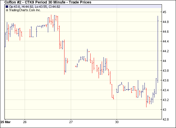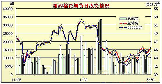 3月30日市場(chǎng)對(duì)于汽車業(yè)破產(chǎn)的擔(dān)心,美國(guó)股市大幅回調(diào),美元繼續(xù)走強(qiáng),大宗商品也大幅下跌,期棉早盤走勢(shì)平淡無(wú)奇,但尾盤一小時(shí)大幅拉升,盤終5月合約漲105點(diǎn)收于44.39美分,7月合約漲113點(diǎn)收于45.44美分。當(dāng)日紐約期棉微弱高開,受外圍市場(chǎng)普遍下跌影響,早盤期間偏弱窄幅震蕩,市場(chǎng)靜候?qū)⒂谥芏嫉腢SDA種植面積報(bào)告,交易臨近最后一小時(shí),市場(chǎng)發(fā)生風(fēng)云變化,投機(jī)空頭回補(bǔ),促進(jìn)期棉上漲,并在44.24美分處觸發(fā)止損買盤,期棉快速拉升,最高44.92美分,依然沒(méi)有突破45美分,盤終各合約漲幅均過(guò)百點(diǎn)。30日,全球資本市場(chǎng)呈現(xiàn)回落態(tài)勢(shì),美國(guó)標(biāo)普500指數(shù)跌3.48%,原油大幅下跌3.97美元結(jié)算價(jià)收于48.41美元,CRB指數(shù)大幅下跌7.09至215.17,基本抹去前2周的漲幅。市場(chǎng)分析師預(yù)估美棉種植面積為780-856萬(wàn)英畝之間。 紐約棉花期貨首期0905合約近三個(gè)交易日交易走勢(shì) |