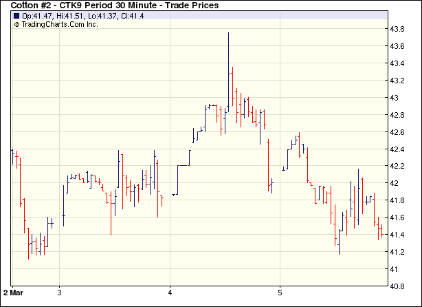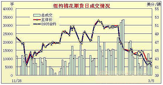 3月5日,市場發(fā)現(xiàn)關(guān)于中國政府的利好傳言并未兌現(xiàn),同時美國通用汽車破產(chǎn)憂慮也對美股產(chǎn)生壓力,導(dǎo)致全球資本市場全面回吐前日漲幅,紐約期棉也尾隨大勢,盤終各合約中幅收跌。當(dāng)日期棉小幅高開,早盤有所上揚(yáng),5月合約最高上漲至42.59美分/磅,然而高位拋盤壓力顯現(xiàn),同時全球股市因中國利好未兌現(xiàn)而出現(xiàn)普跌,增添期棉壓力,各合約小幅上沖后均隨外圍跌勢快速回落,盤終主力5月合約跌58點收于41.38美分/磅。美棉出口周報顯示,2.20-2.26日一周美國共簽約出口本年度陸地棉54499噸,較前一周減少59%;出口裝運(yùn)54975噸,較前一周增加65%,較近四周平均增加42%,裝運(yùn)量略超市場之預(yù)期。 紐約棉花期貨主力0905合約近三個交易日交易走勢 |