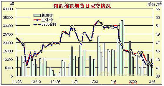 3月6日,外圍市場再度企穩(wěn),股市和原油上漲,帶動期棉早盤大幅上揚,但獲利平倉盤打壓期棉回落,盤終3月和5月合約微弱收漲,其它合約跌勢不一。當日紐約期棉小幅高開,美元走弱,兼原油反彈推動期棉快速上揚,空頭回補,5月合約最高上漲至42.62美分/磅,但是高位獲利平倉壓力呈現(xiàn),促使期棉震蕩回落,盤終主力5月合約微漲5點收于41.43美分/磅。 紐約棉花期貨主力0905合約近三個交易日交易走勢 |