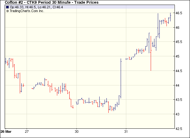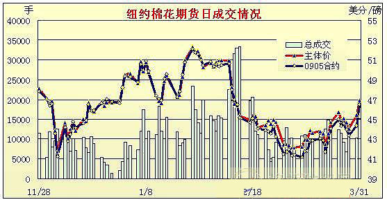 3月31日紐約期棉受外圍谷物市場(chǎng)影響,在買盤強(qiáng)勁支持下大幅收漲,同時(shí)當(dāng)日成交量達(dá)7周以來最高點(diǎn)。當(dāng)日期棉市場(chǎng)小幅高開,在買盤支持下震蕩走高。盤中USDA公布下年度美棉種植面積預(yù)測(cè)為881.15萬畝,較上年度減少7%,減少幅度低于市場(chǎng)普遍預(yù)期,因此棉市賣盤發(fā)起進(jìn)攻,對(duì)價(jià)格形成打壓。然而受外圍谷物走強(qiáng)的影響,期棉買盤很快再次興起,助價(jià)格大幅反彈并收高。5月合約盤中最高至46.50美分/磅,收于46.47美分/磅,漲208點(diǎn);其它合約漲幅為147-196點(diǎn)。 紐約棉花期貨首期0905合約近三個(gè)交易日交易走勢(shì) |