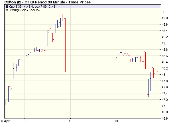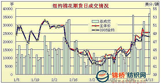 復(fù)活節(jié)過后紐約期棉成交縮量,除近期5月合約小幅收跌外,其它合約均小幅收漲。當(dāng)日棉市開盤后小幅震蕩走高,5月合約最高至48.91美分/磅,較開盤高70點(diǎn)。美國(guó)股市開盤后,帶動(dòng)原油及玉米期貨走弱,同時(shí)期棉受壓加之買盤衰落引發(fā)價(jià)格下滑,5月合約最低至46.75美分/磅。尾盤時(shí)買盤再度興起,使價(jià)格低點(diǎn)反彈,收復(fù)跌幅;當(dāng)日僅近期5月合約小幅收跌,其它合約小幅收漲。5月合約跌26點(diǎn),收于48.15美分/磅;7月合約漲25點(diǎn),收于48.98美分/磅。 紐約棉花期貨首期0905合約近三個(gè)交易日交易走勢(shì) |