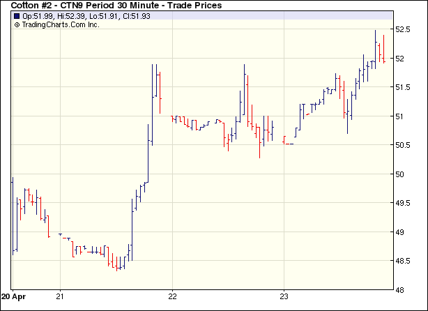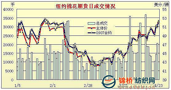 4月23日紐約期棉看漲期權(quán)和投機買盤為市場帶來支撐,各合約大幅收漲,近期5月合約和主力7月合約分別突破51美分和52美分。當(dāng)日市場開盤后一度小幅下滑,基金買入看漲期權(quán)助7月合約和12月合約走高,同時投機買盤活躍將棉價推至高點;5月合約最高至52.00美分/磅;7月合約最高至52.47美分/磅。盤終各合約大幅收漲,5月合約漲幅最大,為171點,收于51.00美分/磅;7月合約漲132點,收于52.11美分/磅。上周美國凈簽約出口本年度陸地棉58582噸,較前一周減少12%;裝運53796噸,較前周增3%。當(dāng)周凈簽約出口本年度皮馬棉726噸,裝運454噸。下年度棉花簽約活躍,包括09/10年度陸地棉11839噸,皮馬棉227噸。 紐約棉花期貨主力0907合約近三個交易日交易走勢 |