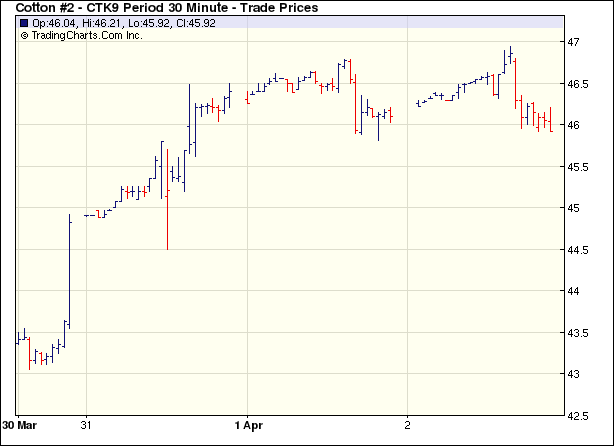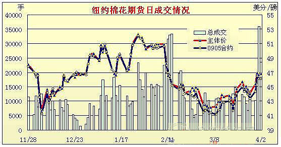 3月2日紐約期棉沖高回落,成交量繼續(xù)萎縮,收于盤整。當日期棉小幅高開,由于外圍商品市場及美國股市走強且美棉出口周報利好,在買盤支持下棉市震蕩走高,5月合約最高至46.94美分/磅。后買盤乏力,賣盤興起,主力合約漲幅回落。當日期棉以盤整收場各合約漲跌幅度在10點左右;5月合約跌2點,收于46.13美分/磅;7月合約跌1點,收于47.05美分/磅。3.20-3.26一周美國凈簽約出口本年度陸地棉91444噸,較前一周增加26%;裝運67563噸,為本年度最高,較前一周增45%。當周凈簽約出口本年度皮馬棉1429噸,裝運476噸。凈簽約出口09/10年度陸地棉5194噸。 紐約棉花期貨首期0905合約近三個交易日交易走勢 |