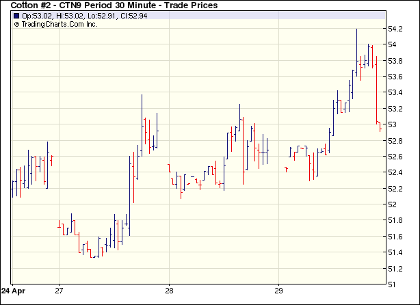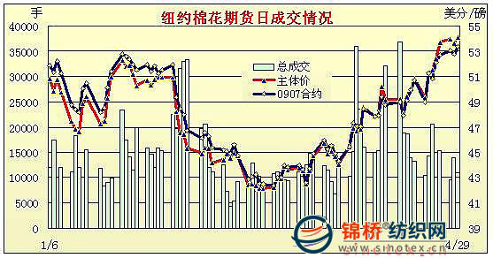 4月29日紐約期棉期棉受外圍利好支撐,在買盤支持下盤中大幅沖高,并收于6個(gè)月來高點(diǎn)。當(dāng)日期棉市場平開高走,由于美國第一季度經(jīng)濟(jì)萎縮幅度小于市場預(yù)期以及美聯(lián)儲(chǔ)認(rèn)為美國經(jīng)濟(jì)衰退速度減緩,美股強(qiáng)勁反彈,主要股指全線飆升2%以上;同時(shí)商品期貨市場走強(qiáng),為期棉帶來支撐,在投機(jī)及基金買盤的支持下,棉價(jià)大幅攀升,7月合約最高至54.19美分/磅。受賣盤打壓,收盤前棉價(jià)回落,多數(shù)合約小幅收漲;5月合約漲79點(diǎn),收于52.84美分/磅;7月合約漲59點(diǎn),收于53.34美分/磅,為08年11月初以來最高點(diǎn)。 紐約棉花期貨主力0907合約近三個(gè)交易日交易走勢 |