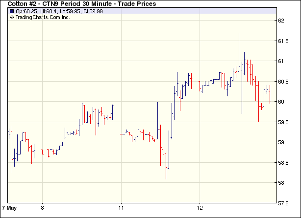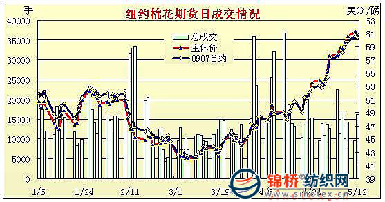 5月12日紐約期棉0907月合約在繼前九個交易日收陽后,在獲利了結(jié)的狙擊下全面收跌,前三份合約跌幅相對較小,其中7月合約收于60.32美分/磅,跌22點,后面合約跌幅均在百點之上。市場前多半個交易日都處于穩(wěn)定的狀態(tài),外部原油期貨、玉米和大豆期貨都走高,美元下跌給予助力。待USDA(美國農(nóng)業(yè)部)報告出臺后,雖然當中2009/10年度的預(yù)測顯示下年度全球棉花減產(chǎn)、消費增加,期末庫存果真減少,但市場獲得利好程度有限,獲利平倉和相關(guān)期權(quán)賣盤導(dǎo)致市場高位滑落,結(jié)束連漲。 紐約棉花期貨近期0907合約近三個交易日交易走勢 |