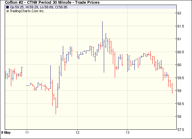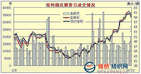5月13日市場(chǎng)再度全面下跌,近期7月合約收于59.04美分/磅,跌128點(diǎn),0912月合約收于61.03美分/磅,跌111點(diǎn)。經(jīng)濟(jì)層面出現(xiàn)利空消息,美國(guó)股市下跌,連累期棉走低。當(dāng)日市場(chǎng)上半個(gè)交易日走勢(shì)穩(wěn)定。美國(guó)經(jīng)過季節(jié)性因素調(diào)整之后的4月份零售業(yè)銷售收入環(huán)比減少了0.4%,為過去10個(gè)月內(nèi)第八次下滑,美國(guó)股市受挫下滑,另外美元走強(qiáng)、相關(guān)期權(quán)賣盤及貿(mào)易賣盤致使期棉承受更多壓力,最終全線走低。整個(gè)經(jīng)濟(jì)層面的壓力仍可忽視,期棉下跌并不意外,但市場(chǎng)向上走的可能性大,現(xiàn)在或許是賣出套保的時(shí)機(jī)。 紐約棉花期貨近期0907合約近三個(gè)交易日交易走勢(shì) |