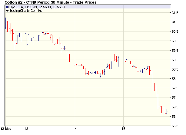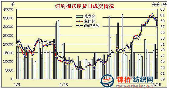 5月15日紐約期棉市場大幅下跌,近期7月合約收于56.30美分/磅,跌276點,跌幅約5%;0912月合約59.07美分,跌200點。市場嚴重超買和獲利了結,以及外部市場給予過重壓力,市場繼續(xù)低頭向下。市場開盤穩(wěn)中走弱,外部商品市場下跌及美元走強,“連拉帶拽”迫使期棉市場受壓下滑;技術面市場嚴重超買,激發(fā)更多多頭拋盤壓力;11-16日一周,7月合約周初攀上60美分后,遭遇套?;鹳u盤,另外也有交易商分別在58、57.4和57美分設止損套保賣單,給市場一定打擊。 紐約棉花期貨近期0907合約近三個交易日交易走勢 |