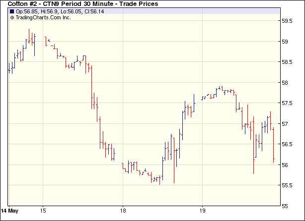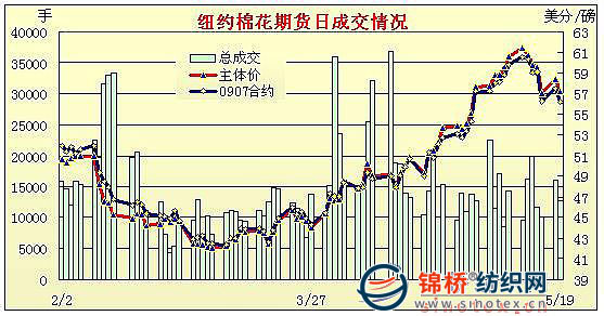 5月19日外部谷物市場表現(xiàn)穩(wěn)定,但紐約期棉市場先穩(wěn)后跌,近期7月合約收于56.22美分/磅,跌133點,0912月合約收于59.48美分,跌90點。當日市場開盤走高,少量貿(mào)易買盤給予支持。當7月合約觸及技術(shù)阻力位59.90美分時,基金賣盤和獲利了結(jié)賣盤打壓,市場步入震蕩下跌的局勢中,最終全面收低。 紐約棉花期貨近期0907合約近三個交易日交易走勢 |