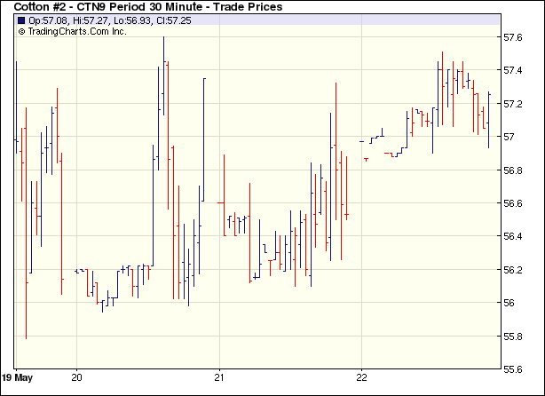5月22日紐約期棉市場小幅回彈,近期7月合約收于57.11美分/磅,漲33點,0912月合約收于60.38美分/磅,漲34點。美元持續(xù)下跌,給整個商品市場提供上漲動力,包括期棉。市場成交量小,波動空間不大。當日市場穩(wěn)定開盤后一路上揚,美元下跌至由去年12月中旬以來的最低水平,商品市場則相應(yīng)上漲,給期棉以支持,7月合約最高上漲至57.51美分(+73點)。尾段,受大豆期貨市場收盤前的獲利了結(jié)影響,期棉回吐部分漲幅,但最終仍以小漲收盤。 紐約棉花期貨近期0907合約近三個交易日交易走勢 |