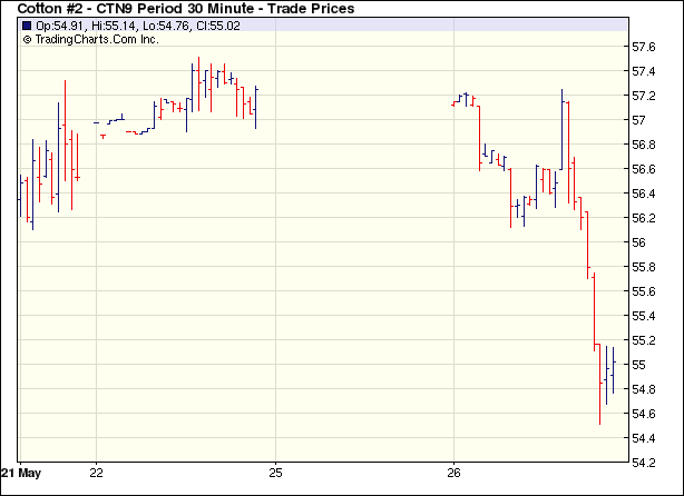 5月26日紐約期棉大幅度收跌,近期7月合約收于55.06美分/磅,跌205點,跌至近一個月來的低點;0912月合約跌181點,收于58.57美分。美國消費者信心指數(shù)高于預(yù)期,美國股市和原油期貨上漲,幫助期棉市場穩(wěn)定開盤,后由于大量技術(shù)性賣盤打壓,市場掉頭下跌,7月合約在跌破關(guān)鍵技術(shù)支持點56.11美分后引發(fā)大量止損賣單,市場進一步走低,并洞穿上周的低點55.52美分,盤中跌破55美分。在最后階段,市場觸底反彈,7月合約收盤價稍高于55美分。 紐約棉花期貨近期0907合約近三個交易日交易走勢 |