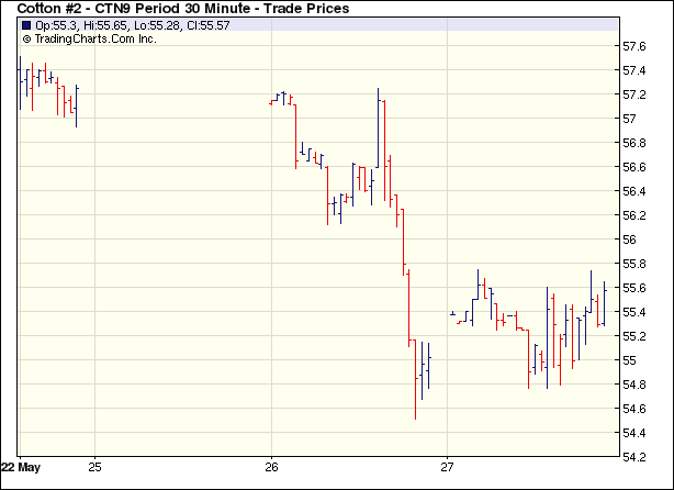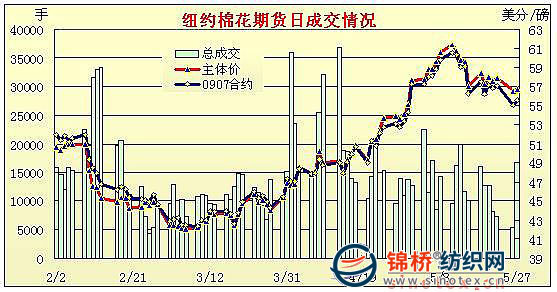 5月17日紐約期棉拋開外部美元上漲、股市下跌以及美國南德州獲得利好將于的因素,獨(dú)立收漲。近期7月合約收于55.58美分/磅,漲52點(diǎn),0912月合約收于59.06美分,漲49點(diǎn),其他合約以54-76點(diǎn)不等幅度收高。盡管外部市場走勢不利,但在前一日大跌后紐約期棉市場開盤穩(wěn)定,投機(jī)買盤和貿(mào)易買盤促進(jìn)市場進(jìn)一步走高。7月合約最高達(dá)到55.75美分后,因受到獲利了結(jié)賣盤打壓結(jié)束繼續(xù)沖高之勢,后期震蕩上揚(yáng),最終以中幅上漲收盤。 紐約棉花期貨近期0907合約近三個(gè)交易日交易走勢 |