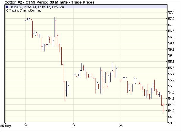 5月28日紐約期棉大幅度下跌,近期7月合約收于54.23美分/磅,跌135點,0912月合約收于58.11美分/磅,跌95點。雖然外部市場美元下跌及商品市場上揚,而期棉再度走出獨立行情全面下跌。市場低開低走。雖然外部商品市場走高,但基本面上4月份美國紡織廠用棉消費量減少、美棉出口前景不容樂觀以及美國主產(chǎn)棉區(qū)德州利好降雨范圍擴大,對期棉給予打擊;買盤跟進量少,投機賣盤打壓,7月合約跌破技術(shù)支撐位54.50美分,最終收于近低點。據(jù)分析,5月后期紐約期棉跌多漲少,前期漲幅逐步消化,市場壓力盡顯。