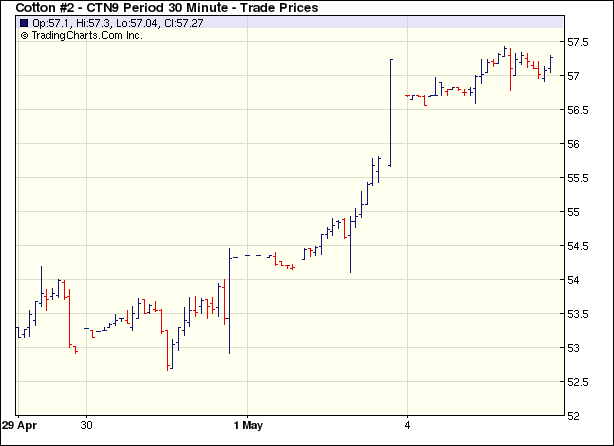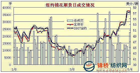5月4日紐約期棉市場波動幅度不大,進入交割期的近期5月合約小漲30點,主力7月合約漲2點,其他多數合約以小幅下跌收盤。上周紐約期棉多數交易日收漲,但市場同時也顯現出超買跡象,有回調的要求,相關的期權交易也給市場帶來壓力,4日市場整體處于弱勢。好在受外部原油期貨上漲、美股走強和美元下跌給予支持,期棉跌幅有限。市場早盤低位震蕩,后7月合約得到基金買盤支持,成功站穩(wěn)于關鍵阻力位57.20美分之上,其他多數合約則因少量買盤小幅收低。 紐約棉花期貨主力0907合約近三個交易日交易走勢 |