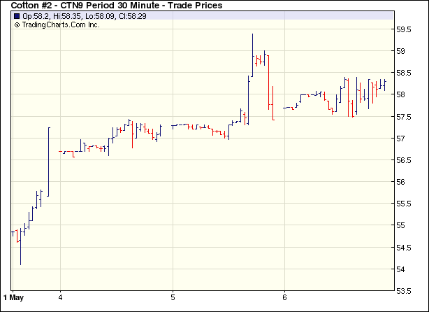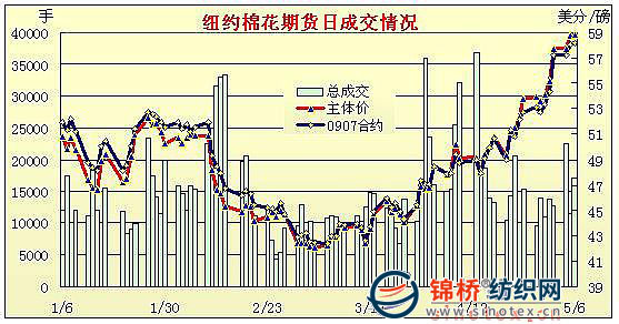 5月6日紐約期棉表現(xiàn)以震蕩為主,主力7月合約收于58.17美分/磅,漲12點(diǎn),盤中在57.25-58.40美分之間波動(dòng)。在前幾個(gè)交易日期棉市場(chǎng)多以上漲收盤,6日開盤市場(chǎng)動(dòng)能顯示不足,低開低走。外圍谷物期貨、原油和美國(guó)股市上漲,刺激期棉穩(wěn)住形勢(shì)。最終,市場(chǎng)以多跌少漲收盤,收漲/跌幅度不大?;鸷屯稒C(jī)商買盤活力相比前幾個(gè)交易日有所萎縮,市場(chǎng)正等待著美國(guó)農(nóng)業(yè)部8日的美棉出口周報(bào)和12日將公布的全球棉花供需報(bào)告,本月報(bào)告中美國(guó)農(nóng)業(yè)部將首次公布對(duì)09/10年度全球棉花供需預(yù)測(cè)。 紐約棉花期貨主力0907合約近三個(gè)交易日交易走勢(shì) |