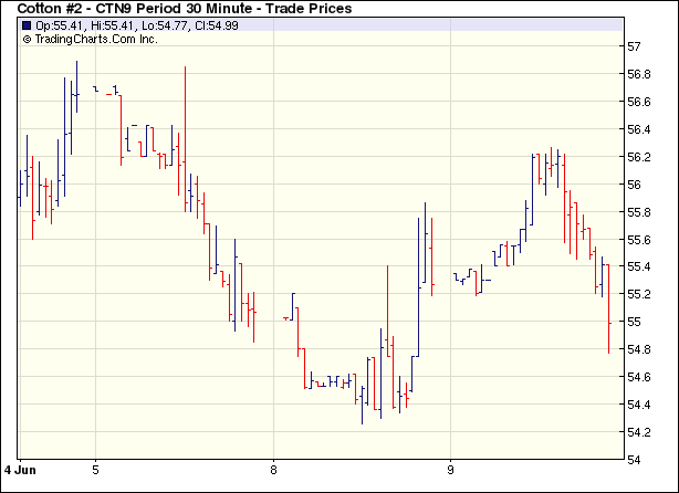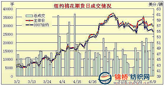 6月9日雖美元走弱,外圍市場走強(qiáng),但紐約期棉受賣盤打壓,小幅收跌,當(dāng)日成交縮量。7月合約跌81點(diǎn),收于54.86美分/磅;10月合約跌72點(diǎn),收于57.60美分/磅。當(dāng)日市場低開后小幅震蕩,受外圍商品市場的帶動(dòng),午盤后一度高走,7月合約最高至56.27美分/磅,較開盤上漲1.02美分;但隨后在賣盤打壓下很快回落,7月合約最低至54.77美分/磅,盤終中幅收跌。隨著持倉重心轉(zhuǎn)移,目前12月合約的持倉量已超過7月合約。 紐約棉花期貨近期0907合約近三個(gè)交易日交易走勢(shì) |