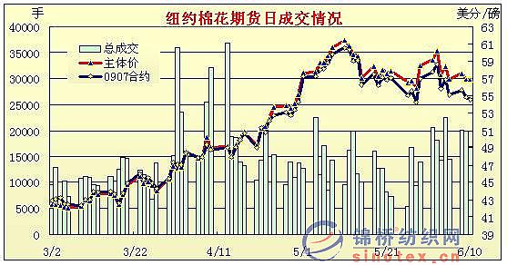 由于美元走強,6月10日紐約期棉再度受到賣盤打壓,隨外圍農(nóng)產(chǎn)品市場一起走弱收跌。7月合約跌23點,收于54.63美分/磅;10月合約跌22點,收于57.38美分/磅。當(dāng)日市場平開高走,7月合約最高至56.20美分/磅,較開盤漲110點。午盤后受美元走強的影響,期棉價格回落并小幅收跌,各合約跌幅為17-23點。 紐約棉花期貨近期0907合約近三個交易日交易走勢