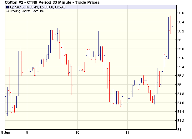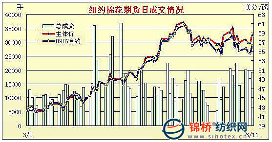 6月11日美元下跌助商品市場(chǎng)走強(qiáng),紐約期棉交投活躍,各合約大幅上漲,7月合約收于本周來(lái)最高點(diǎn)。當(dāng)日美元收跌,推動(dòng)資金流入商品市場(chǎng)。紐約期棉小幅高開(kāi)后震蕩走高,午盤后漲幅加劇,尾盤時(shí)7月合約達(dá)56.54美分/磅。盤終各合約大幅收漲,7月合約收于56.30美分/磅,漲167點(diǎn);10月合約漲180點(diǎn),收于59.18美分/磅。 紐約棉花期貨近期0907合約近三個(gè)交易日交易走勢(shì) |