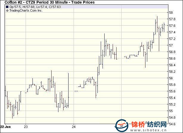 6月25日,紐約期棉受到外圍市場提振,在買盤支持下各合約再度收漲,走出三連陽;成交量繼續(xù)縮減。當(dāng)日主力合約低開震蕩,后受外圍商品市場走強(qiáng)的帶動(dòng),在投機(jī)買盤支持下,午盤后中幅攀高,12月合約最高至57.88美分/磅,收盤前略有回落。盤終各合約漲幅64-101點(diǎn)不等。7月合約收于53.02美分/磅,漲73點(diǎn);主力12月合約收于57.49美分/磅,漲67點(diǎn)。 紐約棉花期貨主力0912合約近三個(gè)交易日交易走勢 |
