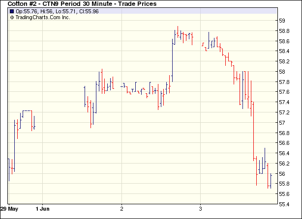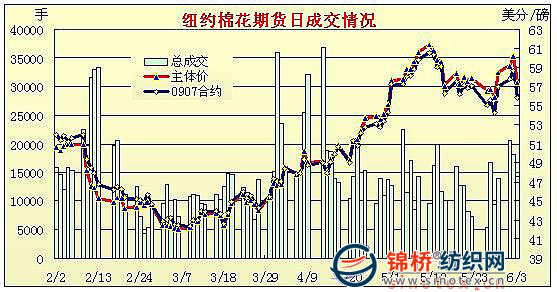 經(jīng)過連續(xù)三天上漲之后,6月3日紐約期棉大幅回落,近期和約接近跌停。當(dāng)日美元走強(qiáng),原油及谷物等商品市場受到打壓。紐約期棉受外圍市場影響,開盤后一路走低,在賣盤的打壓下7月合約最低至55.71美分/磅,較開盤跌299點(diǎn)。盤終各合約收于低點(diǎn),7月合約跌281點(diǎn),收于55.84美分/磅;12月合約跌292點(diǎn),收于58.01美分/磅,跌幅最大;其它合約跌幅在250點(diǎn)左右。 紐約棉花期貨近期0907合約近三個交易日交易走勢 |