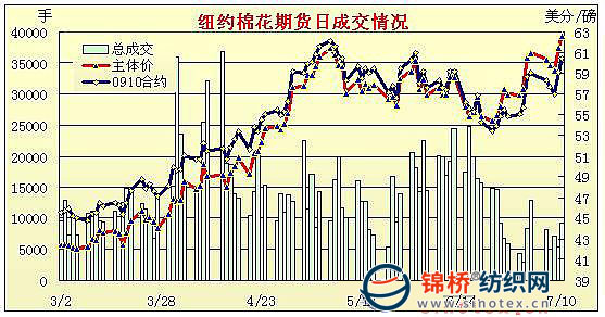 7月10日美元走強(qiáng),同時(shí)USDA報(bào)告偏利空,調(diào)增新年度美棉和全球的期末庫(kù)存,但技術(shù)買盤推動(dòng)期棉繼續(xù)強(qiáng)勢(shì)走高,交投活躍,盤終12月合約漲132點(diǎn)收于62.45美分。當(dāng)日紐約期棉開盤后震蕩走低,但在美元強(qiáng)勢(shì)和USDA偏于利空的報(bào)告出臺(tái)后,技術(shù)買盤占據(jù)上風(fēng),支撐12月合約連續(xù)上漲,在61.22,61.29和61.69美分/磅處觸發(fā)止損買盤,不過(guò)時(shí)值周末,獲利平倉(cāng)盤高位打壓,令12月合約未能突破關(guān)鍵阻力位,但盤終各合約依然收在高位,前三份合約漲幅過(guò)百。期棉逆勢(shì)上漲,市場(chǎng)分析,一方面與技術(shù)面有關(guān),9日移動(dòng)平均線已經(jīng)升破40日移動(dòng)平均線;另一方面或許與德州的高溫干旱天氣有關(guān)。美國(guó)農(nóng)業(yè)部(USDA)最新7月預(yù)測(cè)中調(diào)減本年度全球棉花產(chǎn)量和消費(fèi)量,調(diào)增全球進(jìn)出口量及期末庫(kù)存。下年度產(chǎn)量、進(jìn)出口貿(mào)易量及消費(fèi)量均小幅調(diào)減,調(diào)增期末庫(kù)存。 紐約棉花期貨主力0912合約近三個(gè)交易日交易走勢(shì) |