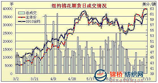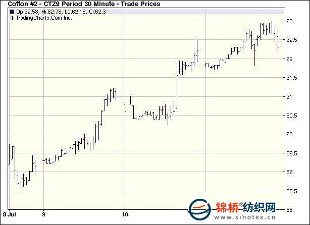 7月13日美元走弱,股市大漲為期棉帶來部分支撐,但其它谷物繼續(xù)弱勢,紐約期棉上漲勁道趨減,USDA報(bào)告關(guān)于下年度的預(yù)測促使遠(yuǎn)期合約壓力較大,盤終只有近期和主力12月合約小幅上揚(yáng),其它合約則下跌,時間越遠(yuǎn),跌幅越大。當(dāng)日期棉開盤后震蕩走低,但在美元走低和股市大漲的刺激下,期棉緩慢回升,與其它大宗商品走勢依然形成對比,盤中12月合約最高漲至63美分/磅,為近八周新高,但高位快速回落,遠(yuǎn)期合約由于USDA報(bào)告調(diào)降下年度產(chǎn)量和出口量,調(diào)增美棉的期末庫存,因此承受壓力較大,盤終遠(yuǎn)期合約普跌,只有近期合約漲57點(diǎn),主力10月合約漲21點(diǎn)。另市場缺乏方向指引,交易商等候本周公布的經(jīng)濟(jì)數(shù)據(jù),交投縮量。 紐約棉花期貨主力0912合約近三個交易日交易走勢 |