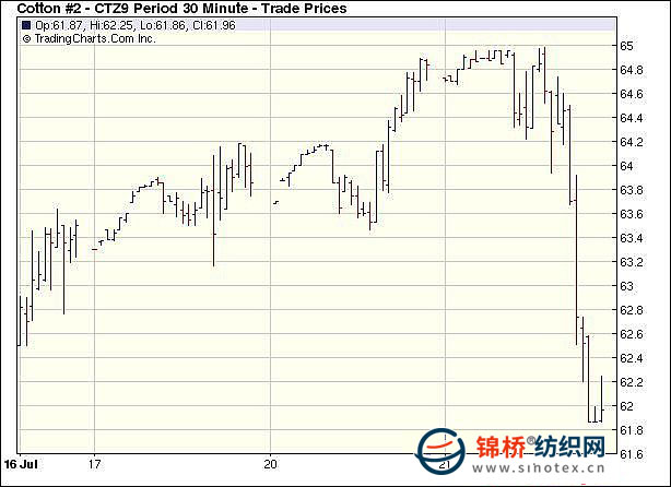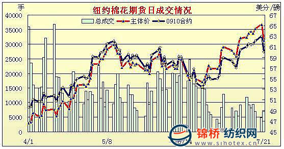 7月21日美聯(lián)儲(chǔ)主席伯南克國(guó)會(huì)發(fā)言,稱失業(yè)問(wèn)題,房?jī)r(jià)回落兼信貸緊張將影響消費(fèi)者信心,除原油繼續(xù)上漲外,其它大宗商品大多回落,紐約期棉早盤(pán)窄幅震蕩,午盤(pán)后賣盤(pán)放量回落,期棉10月合約收于跌停,而主力合約也跌291點(diǎn),逼近跌停。當(dāng)日紐約期棉開(kāi)盤(pán)后窄幅區(qū)間小幅震蕩,期棉12月合約突破周一高位,上行至64.98美分(漲幅為12點(diǎn)),早盤(pán)收尾時(shí),期棉開(kāi)始回落,跌破周一低點(diǎn)(63.31美分)后激勵(lì)進(jìn)一步的賣盤(pán),獲利回吐,尾盤(pán)最后一個(gè)小時(shí),10月合約跌停,而主力12月也迫近跌停,絕大多數(shù)合約跌幅超過(guò)200點(diǎn)。期權(quán)交投包括2100份看漲期權(quán)和3000看跌期權(quán)。 紐約棉花期貨主力0912合約近三個(gè)交易日交易走勢(shì) |