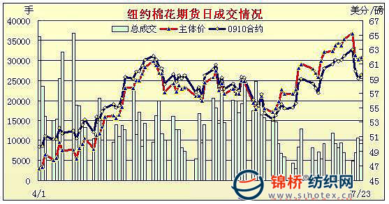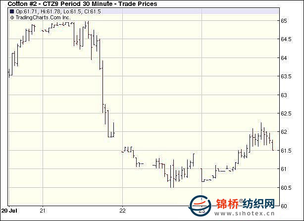 7月23日美國房地產(chǎn)數(shù)據(jù)利好,美股勁升,外圍市場大多反彈上漲,受助于外圍利好,紐約期棉終止持續(xù)二日的跌勢,小幅走高,各合約漲幅均在60點以內(nèi),同時成交低迷。當日早盤期間,紐約期棉繼續(xù)低迷,低位運行,但美元弱勢,外圍品種大多走強,午盤前后期棉緩慢回升,漲至周三高點61.99美分時,早盤的壓力逐漸消失,持續(xù)買盤和外圍利好推動期棉繼續(xù)揚升,12月合約最高至62.24美分,之后有所回落,但其它品種基本收在高位。當日公布的美棉消費和美棉出口似乎對市場并未帶來較大影響,而技術(shù)面因素和外圍環(huán)境似乎起到主要的推動力。 紐約棉花期貨主力0912合約近三個交易日交易走勢 |