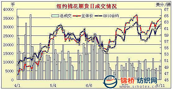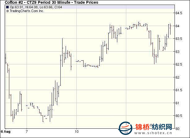 8月11日,紐約期棉走勢呈穩(wěn)-跌-漲的狀態(tài),結(jié)算價(jià)繼續(xù)收高,目前已達(dá)到近三周高點(diǎn),近期10月合約結(jié)算價(jià)62.24美分/磅,漲29點(diǎn),主力12月合約收于64.00美分/磅,漲25點(diǎn)。當(dāng)日期棉市場在穩(wěn)定開盤后前半個(gè)交易日一直維持平穩(wěn)狀態(tài),后受外部美國股市連續(xù)第二日走低及其他部分商品期貨走低連累下跌,最低點(diǎn)至62.42美分(-133點(diǎn))。大豆期貨大幅上漲,輔助期棉從低點(diǎn)反彈,并以小幅收漲。市場成交量低迷,主要是交易商都在等待USDA(美國農(nóng)業(yè)部)的供需月報(bào)和美國面積報(bào)告的發(fā)布。該報(bào)告預(yù)期中性偏空--美國西德州出現(xiàn)及時(shí)降雨,即使其他個(gè)別地區(qū)干旱也不能影響大局,USDA可能調(diào)高美國棉花產(chǎn)量。 紐約棉花期貨主力0912合約近三個(gè)交易日交易走勢 |