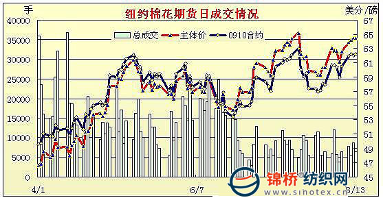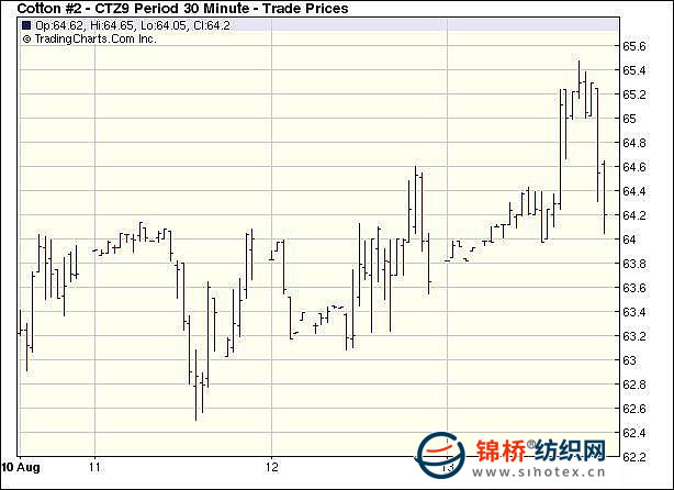 8月13日,紐約期棉盤中上沖到近10個(gè)月高點(diǎn)后回落,僅以小幅上漲收盤,近期10月合約結(jié)算價(jià)62.21美分/磅,漲17點(diǎn),主力12月合約64.09美分/磅,漲21點(diǎn)。受美元下跌和美國(guó)股市上漲帶動(dòng)和場(chǎng)內(nèi)買盤支持,紐約期棉高開高走,當(dāng)市場(chǎng)突破65美分的高點(diǎn)后觸發(fā)多輪止損買單,12月合約最高上沖到65.47美分,為自該合約2008年10月7日來(lái)最高點(diǎn);后因市場(chǎng)上漲到棉農(nóng)鎖定的售棉價(jià)格水平,出現(xiàn)貿(mào)易賣盤打壓,外部谷物期貨市場(chǎng)因基本面壓力走低,期棉受到連累轉(zhuǎn)向回落,最終市場(chǎng)在拉出長(zhǎng)長(zhǎng)的上影線后僅以小漲收市。分析認(rèn)為,市場(chǎng)沖高后將受到獲利了結(jié)的打壓,但技術(shù)面上市場(chǎng)仍有上漲空間?;久嫔希?3美分以上的期貨價(jià)格將“抑制”紡織廠的購(gòu)棉興趣,只有當(dāng)期貨價(jià)格回落到55美分一線,才能刺激現(xiàn)貨市場(chǎng)銷售增加。 紐約棉花期貨主力0912合約近三個(gè)交易日交易走勢(shì) |