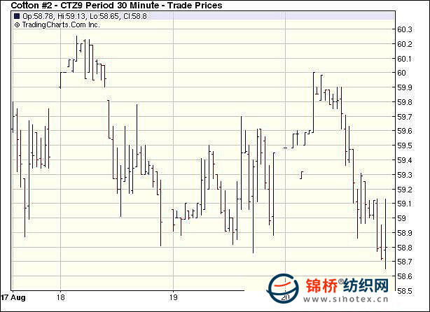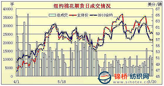 8月20日,紐約期棉市場(chǎng)表現(xiàn)疲軟,10月合約結(jié)算價(jià)56.62美分/磅,跌24點(diǎn),12月合約58.75美分/磅,跌28點(diǎn),總成交量不足6000手。當(dāng)日在投機(jī)商買盤作用下,市場(chǎng)高開(kāi)高走,但12月合約最高點(diǎn)沖至60美分這一技術(shù)阻力位后缺乏動(dòng)能掉頭向下,一來(lái)投機(jī)商無(wú)大動(dòng)作,二來(lái)期棉市場(chǎng)忽略了外部市場(chǎng)美元下跌和股市走強(qiáng)的利好因素。在破位失敗后,12月合約收平于關(guān)鍵技術(shù)支撐點(diǎn)58.75美分位置。8.7-8.13一周美國(guó)凈簽約僅出口09/10年度陸地棉7326噸,較前一周大幅減少;裝運(yùn)陸地棉28939噸、出口皮馬棉1315噸。 紐約棉花期貨主力0912合約近三個(gè)交易日交易走勢(shì) |