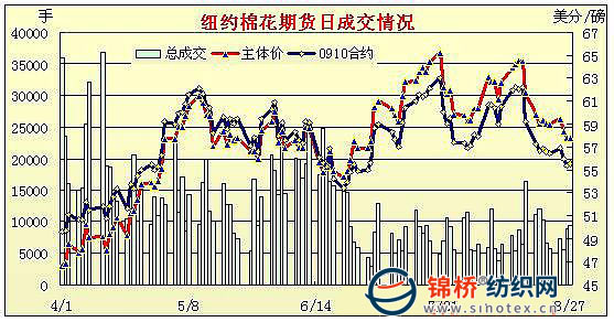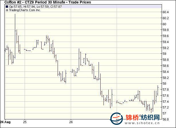 8月27日,紐約期棉以微幅上漲收盤,近期10月合約和主力12月合約同漲17點(diǎn),結(jié)算價(jià)分別為55.54和57.64美分/磅,盤中12月合約波動(dòng)未超出57.00-58.00美分的范圍。當(dāng)日市場上半場交易呈震蕩上揚(yáng)狀態(tài),投機(jī)買盤和貿(mào)易商空頭平倉給予支撐,當(dāng)12月合約最高上漲至57.94美分后上漲動(dòng)能不足,從高點(diǎn)稍稍回落,最終以小幅上漲收盤。外圍谷物期貨市場漲跌不一,美元下跌、美股上揚(yáng),期棉缺乏指引,但在投機(jī)買盤的作用下表現(xiàn)相對(duì)獨(dú)立。美棉出口周報(bào)顯示,上周美棉出口大幅增加,給市場一定支持。據(jù)美國農(nóng)業(yè)部(USDA)公布,8.14-8.20一周美國凈簽約出口09/10年度陸地棉53070噸,較前一周增加6倍;裝運(yùn)本年度陸地棉45518噸,較前周增加57%。 紐約棉花期貨主力0912合約近三個(gè)交易日交易走勢 |
