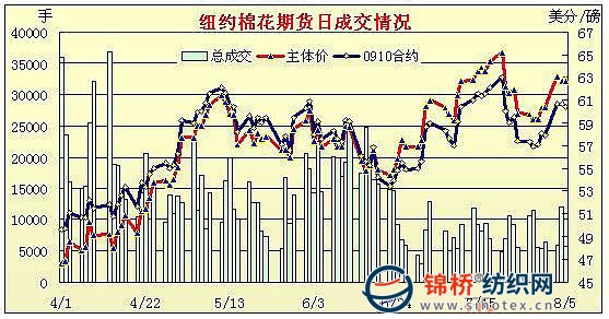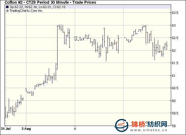 8月5日紐約期棉市場小幅下跌,近期10月合約收于60.39美分/磅,跌26點,主力12月合約62.26美分/磅,跌30點。交易商正觀望USDA(美國農業(yè)部)下周將發(fā)布的棉花供需月報,動作不大,成交低迷。當日市場開盤穩(wěn)定,前大半個交易日呈震蕩走高態(tài)勢;交易僅剩下最后兩個多鐘頭之時,市場遭遇投機賣盤打壓,外部市場漲跌不一無法給期棉帶來指引,最終市場吐盡前面漲幅,全線收跌。未來4-6周中應當關注美國股市的動向,因為股市能折射出美國的經濟情況,這對美元、商品期貨市場和棉花期貨的方向有一定指引作用。目前12月合約在60-65美分之間整固,如果股市進一步上漲,市場在高位盤整的可能性才更大,否則市場將有下行壓力。 紐約棉花期貨主力0912合約近三個交易日交易走勢 |