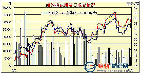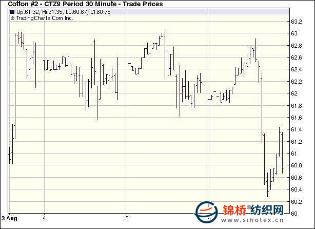 8月6日受外部商品和股票市場下跌刺激,投機賣盤涌現(xiàn),紐約期棉大幅收低,近期10月合約收于58.98美分/磅,跌141點,主力12月合約收于60.86美分,跌140點。當日市場開盤穩(wěn)定,盤中曾試圖向63美分/磅進攻,但當最高點達到62.91美分/磅后遭遇止損賣單壓力反向下跌;美國至關重要的7月份就業(yè)報告和服裝等其他行業(yè)零售商銷售報告即將于8月7日公布,交易商呈謹慎態(tài)度,不敢貿(mào)然行事,外部商品市場和股市疲軟、美元走強,為期棉市場引來投機賣盤。當12月合約跌破21日均線61.69美分后進一步下跌,最低跌至60.27美分,最終以大幅下跌收盤。目前12月合約在60美分以上波動,現(xiàn)貨市場買家下單的意愿不強,美棉銷售緩慢,國際市場小部分國家的紡織廠第四季度庫存已滿。如果股票市場進一步下跌,期棉有挑戰(zhàn)58美分支撐線的可能。 紐約棉花期貨主力0912合約近三個交易日交易走勢 |