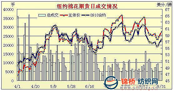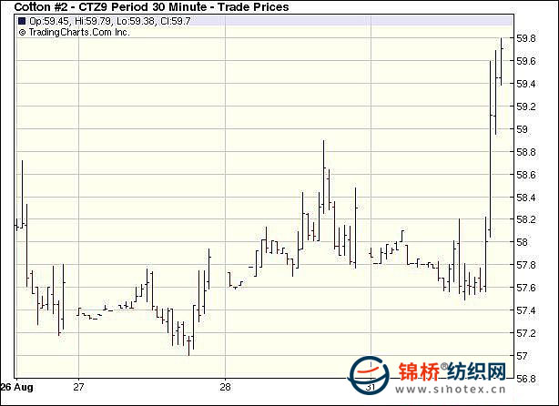 8月31日,臨近尾盤時(shí)受到買盤支持,期棉各合約收漲百點(diǎn)以上,成交量略有增加。紐約期棉連續(xù)第三天收漲,且漲幅放大,當(dāng)日市場開盤穩(wěn)定,由于股市走弱加之原油、玉米、大豆等商品期貨下跌,拖拽期棉中幅下滑,同時(shí)美元盤中走強(qiáng)也給市場施以壓力,主力12月合約最低至57.49美分/磅。午盤后市場中涌現(xiàn)投機(jī)買盤,棉市從低位快速拉升,12月合約最高至59.79美分/磅。盤終各合約均收漲百點(diǎn)以上,10月合約收于57.76美分/磅,漲146點(diǎn);12月合約收于59.74美分/磅,漲140點(diǎn)。 紐約棉花期貨主力0912合約近三個(gè)交易日交易走勢 |