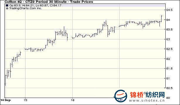 9月17日,紐約期棉在投機(jī)買盤支持下繼續(xù)攀高,維持十一連陽,各合約小幅收高,成交量連續(xù)第五天在萬手以上。當(dāng)日市場微幅高開后在投機(jī)買盤支持下震蕩走高,盤中達(dá)到63.96美分/磅時出發(fā)止損買盤,接近尾盤時主力12月合約突破64美分一線,最終收于64.18美分/磅,漲幅66點(diǎn);近期10月合約收于62.66美分/磅,漲54點(diǎn)。分析師指出,美元走弱及商品市場走強(qiáng)的趨勢有望保持至本月底。期棉連續(xù)11日上漲,累計(jì)漲幅超過500點(diǎn),下一步將直指65美分關(guān)鍵阻力位。 紐約棉花期貨主力0912合約近三個交易日交易走勢 |