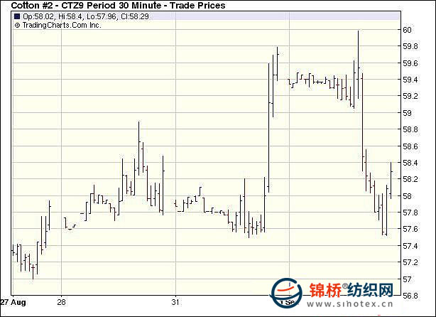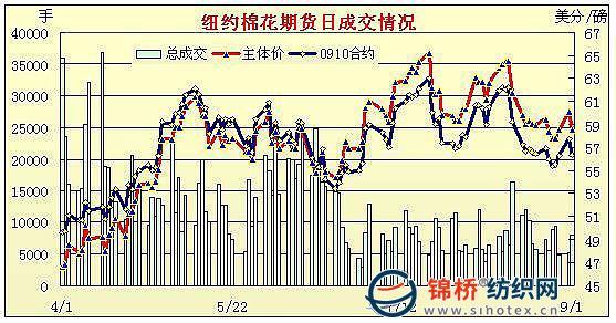 9月1日,紐約期棉成交增量,主力合約上沖未果,外圍市場走弱發(fā)基金拋盤,各合約大幅收跌百點以上,抹去前一日漲幅。當(dāng)日市場低開低走,弱勢震蕩。盤中受買盤支持,主力12月合約一度翻紅,小幅沖高,但由于買盤后續(xù)支持不足,主力合約未能突破關(guān)鍵阻力位60美分/磅,隨后在基金賣盤打壓下大幅下跌,外圍商品市場及股市走弱且美元走強給期棉帶來壓力。尾盤時部分買盤于低位進入市場,使期棉跌幅略有縮小。最終10月合約跌139點,收于56.37美分/磅;12月合約跌139點,收于58.35美分/磅。 紐約棉花期貨主力0912合約近三個交易日交易走勢 |