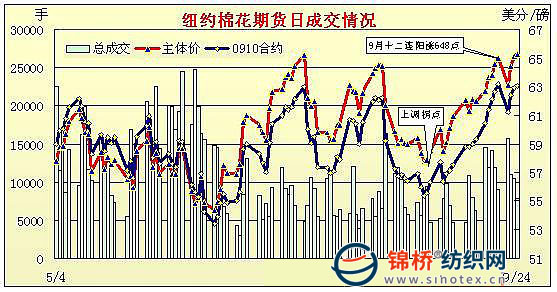 9月24日,紐約期棉收盤(pán)近漲遠(yuǎn)跌,近期10月合約收于63.06美分/磅,主力12月合約收于64.81美分/磅,均漲13點(diǎn)。 當(dāng)日上半場(chǎng)交易市場(chǎng)窄幅波動(dòng);美元升值導(dǎo)致黃金期貨、原油期貨和CRB指數(shù)和美股大幅下跌,棉花期貨市場(chǎng)盤(pán)中受到連累大幅度下跌,12月合約最低跌至63.32美分(-136點(diǎn));后因投機(jī)買(mǎi)盤(pán)支持,市場(chǎng)從低點(diǎn)反彈,12月合約最高64.88美分/磅,達(dá)到近六周高點(diǎn),最終該合約收于近高位。